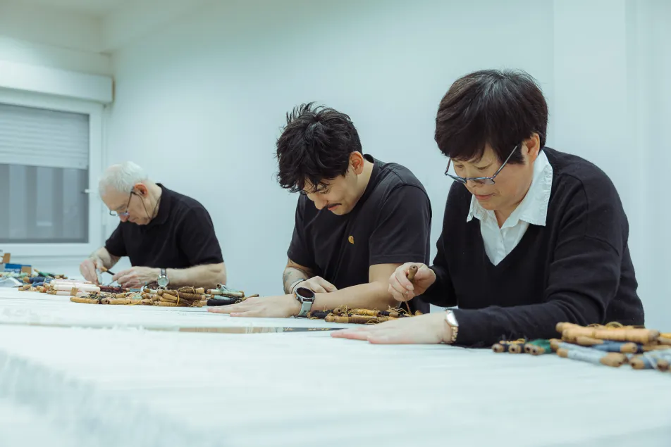 Le carton de cette nouvelle scène a été réalisé par l’artiste Hélène Delprat. Le tissage est confié à l’Atelier Tapisserie Guillot à Aubusson, atelier familial fondé en 2001 par Patrick Guillot, lissier spécialisé dans le tissage de basse-lisse, aujourd’hui accompagné de son épouse Marie et de leur fils Luc, diplômé en 2024 des Métiers d’art.